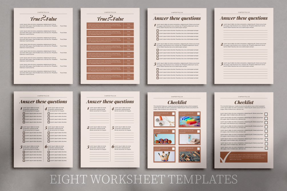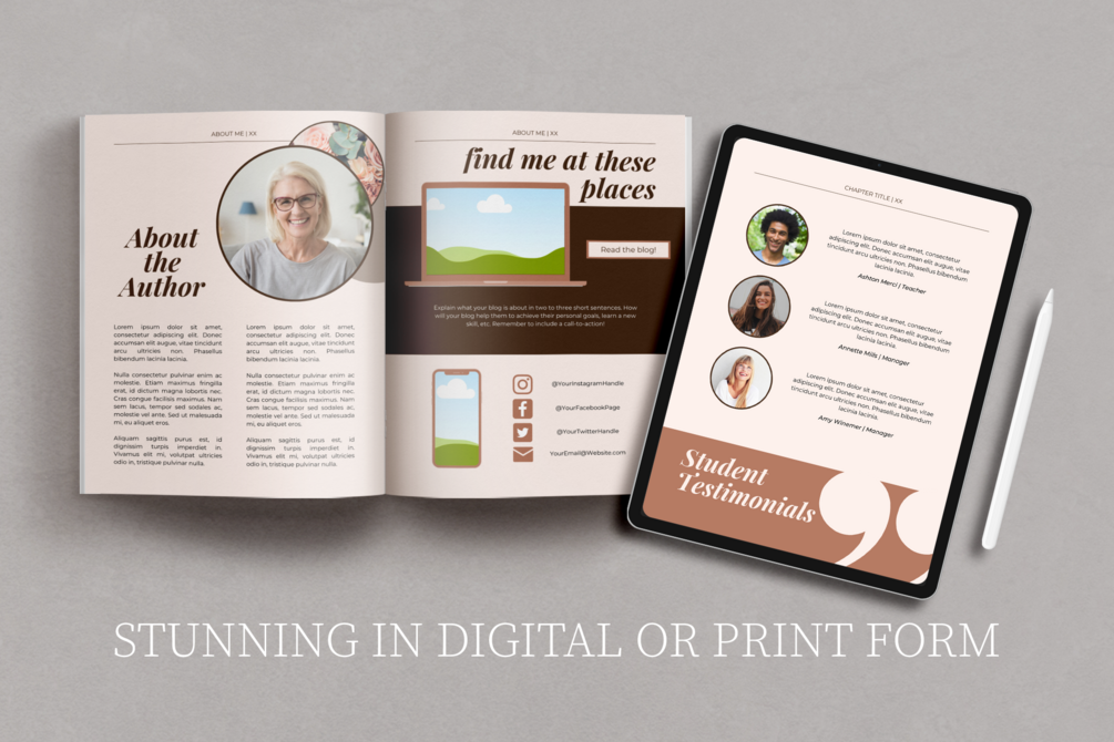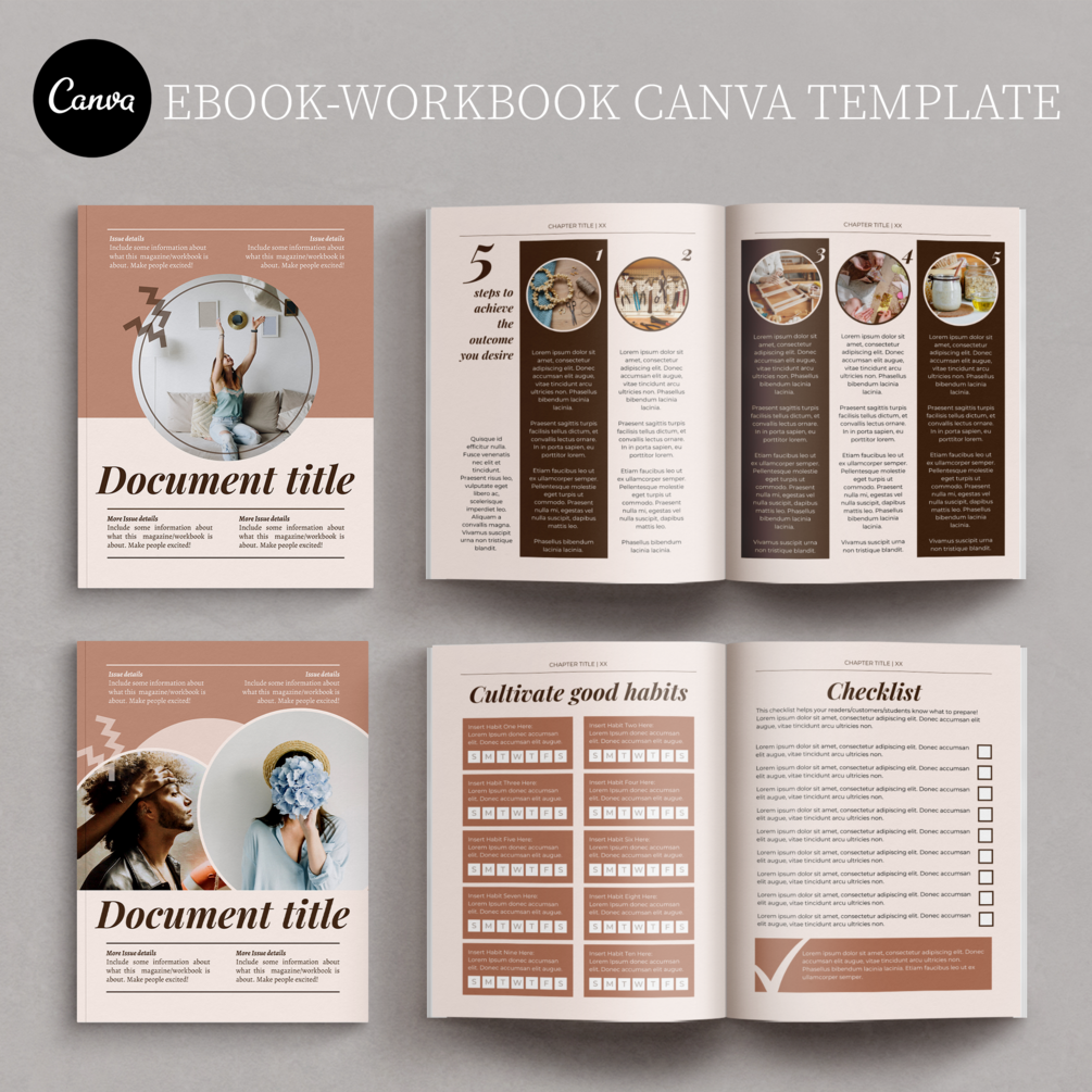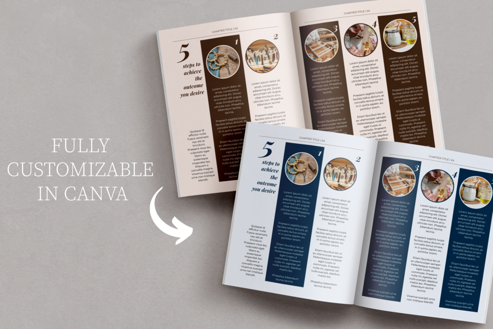 The warm color palette of this eBook-Workbook Canva template is suitable for course creators, creatives, teachers, and workshop hosts. Insert your content and customize it with your images and brand colors to produce your ideal end product! You may use this template to create your mailing list lead magnet or course materials.